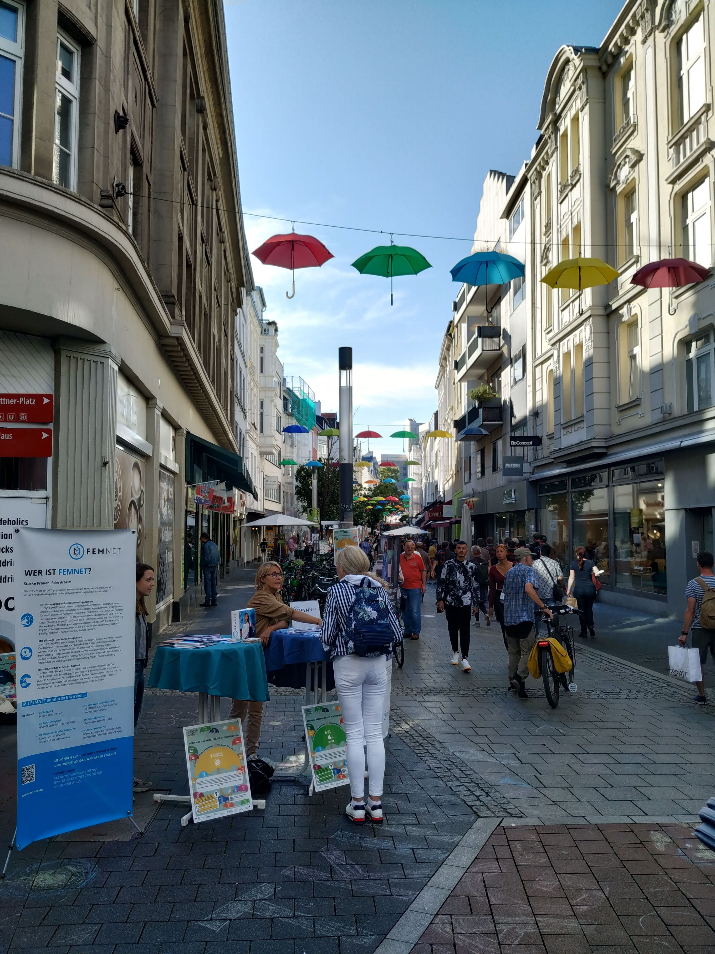 Die bunten Regenschirme in der Straße in der Innenstadt symbolisieren die 17 Ziele und machen die Friedrichstrasse vom 18. September bis zum 4. Oktober 2021 zur 17-Ziele-Zone, in der ein sozial, wirtschaftlich und ökologisch nachhaltiges Bonn zum Thema wird.