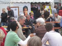 Trotz schlechten Wetters kamen viele BonnerInnen, um mit den Vereinen des Bonner Netzwerks zu sprechen, ein Fragebogen-Gewinspiel durch die Zelte mitzumachen (Abbildung links), sich kulturell-künstlerisch zu erfreuen (Abbildung mitte) oder sich in Einzelgesprächen über die Ziele und Aktivitäten des Bonner Netzwerks zu informieren (Abbildung rechts).
