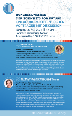 Am Sonntag, den 26. Mai 2024 um 15:00 Uhr organisieren die Scientists for Future, im Rahmen ihres Bundeskongresses, zwei öffentliche Vorträge mit anschließender Diskussion im Forschungsmuseum Koenig, zu dem alle sehr herzlich eingeladen sind. Prof. Dr. Christina Bogner legt die Verbindung zwischen Mikroplastik und Kohlenstoffemissionen und Jun.- Prof. Dr. Lisa Biber-Freudenberger erklärt, wie Biodiversitätsverlust und Klimawandel gleichzeitig bekämpft werden können. Interessierte sind ganz herzlich dazu eingeladen beim Kongress dabei zu sein und darüber hinaus die Veranstaltungen breit über die eigenen Kanäle und Netzwerke mitzubewerben! Weitere Infos können dem Flyer und den anhängendem Dokumenten entnommen werden.