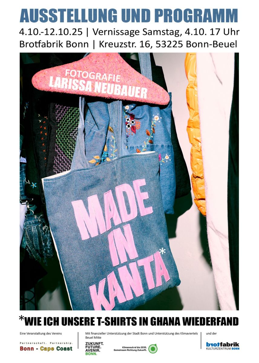 Die Fotos der Ausstellung geben faszinierende Einblicke in den größten Second-Hand Kleidermarkt Westafrikas. Auf dem Kantamanto-Markt in Accra (Ghana) trifft der 'westliche' Überfluss in Zeiten von Fast Fashion auf die Kreativität der Menschen, die dort arbeiten. Sie suchen nachhaltige Lösungen im Umgang mit oft unverkäuflicher Kleidung. Organisiert wird die Ausstellung durch den Verein Partnerschaft Bonn-Cape Coast e.V. / Larissa Neubauer, Fotografin. Die Ausstellung und das Begleitprogramm stehen im Kontext der Projektpartnerschaft, die die Stadt Bonn seit 2008 mit der westghanaischen Küstenstadt Cape Coast verbindet. Auf zivilgesellschaftlicher Ebene wird die Zusammenarbeit durch den Verein "Partnerschaft Bonn-Cape Coast" begleitet. Die Ausstellung findet im Rahmen der Bonner SDG-Tage 2025 statt.