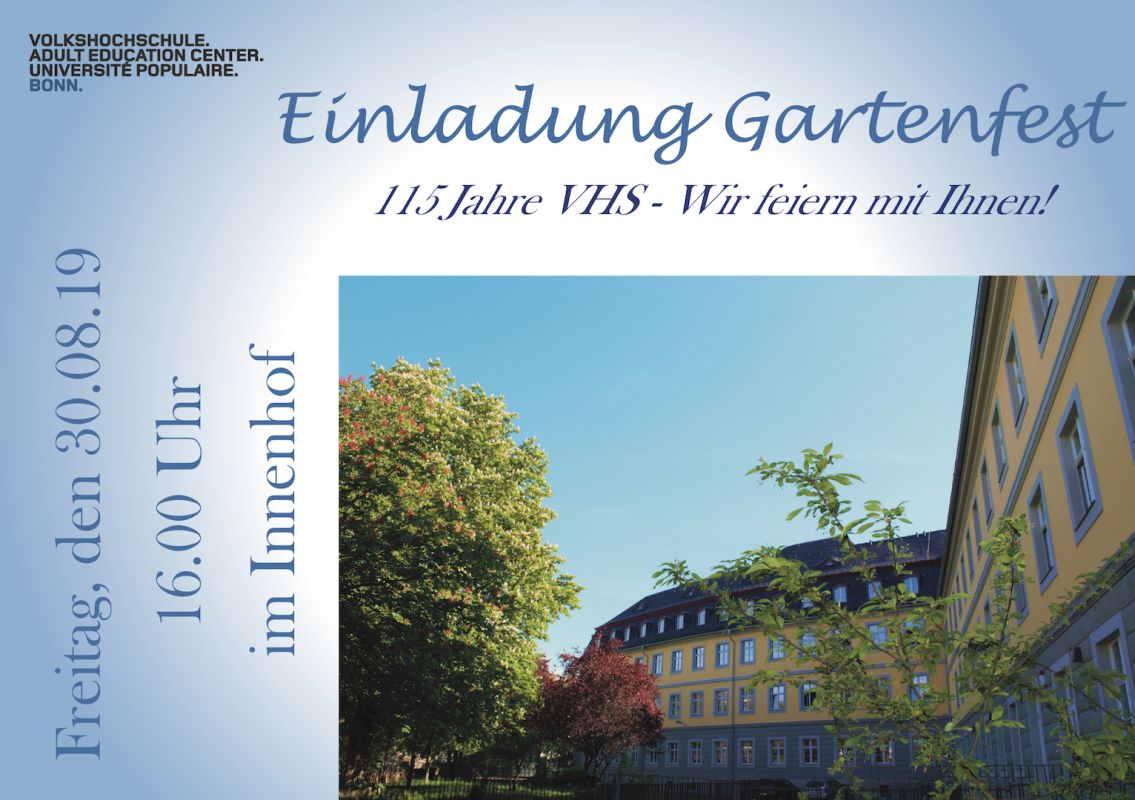 Die Volkshochschulen in Deutschland blicken 2019 auf ihr 100jähriges Bestehen zurück. Als eine von ganz wenigen ist die Bonner Volkshochschule schon älter als 100 Jahre, und es gibt Anlass zu feiern: Gemeinsam mit Gästen und Partnern wird ihr 115. Geburtstag im Hof des Hauses der Bildung begangen. Unter anderem mit einem Willkommensgruß von Kultur- und Sportdezernentin Frau Dr. Schneider-Bönninger, mit spielerischen Unterhaltungen und einem kommunikatives Ambiente, mit Speis und Trank und einem Grußwort von OB Sridharan gegen 18 Uhr. Unterstützt wird das Fest vom Förderverein der Volkshochschule Bonn, von der Sparkasse Köln-Bonn, dem Theater und der Stadtbibliothek. Um eine verbindliche Anmeldung wird gebeten unter: vhs(at)bonn.de.