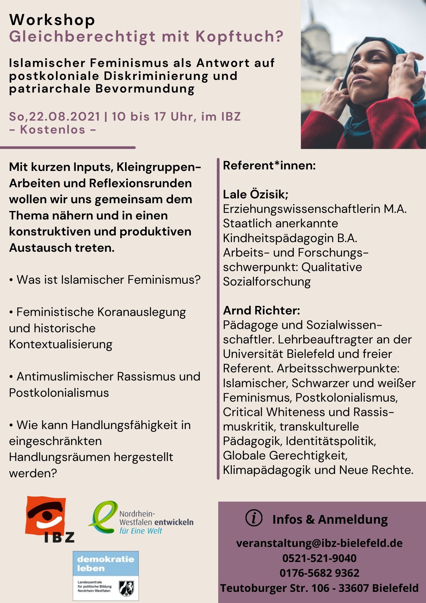 Die „Stellung der Frau im Islam“ ist ein kontroverses Dauerthema in den Medien, der Politik und in islamischen Communities. Von Seiten der Mehrheitsgesellschaft wird Ihnen oft vermittelt, dass sie sich nur emanzipieren können, wenn sie auf Distanz zu ihrer Religion gehen, das Kopftuch ablegen und westliche Werte übernähmen. In ihren eigenen Communities und Familien wiederum müssen sie sich immer wieder gegen eingefahrene patriarchale Strukturen und männliche Korandeutungen behaupten.