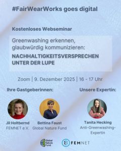 Begriffe wie „nachhaltig“, „fair produziert“ oder „klimaneutral“ begegnen Verbraucher:innen täglich – auf Etiketten, Websites oder in Katalogen. Doch wie verlässlich sind diese Aussagen? Im 8. Webseminar der Reihe #FairWearWorks goes digital erläutert Nachhaltigkeitsexpertin Tanita Hecking, wie Greenwashing rechtlich geahndet werden kann, wo aktuelle Grenzen liegen und welche Nachhaltigkeitsaussagen besonders problematisch sind. Zudem zeigt das Seminar, wie Unternehmen transparent und glaubwürdig kommunizieren können und woran sich Social Washing erkennen lässt. Hier geht es zur Online-Anmeldung