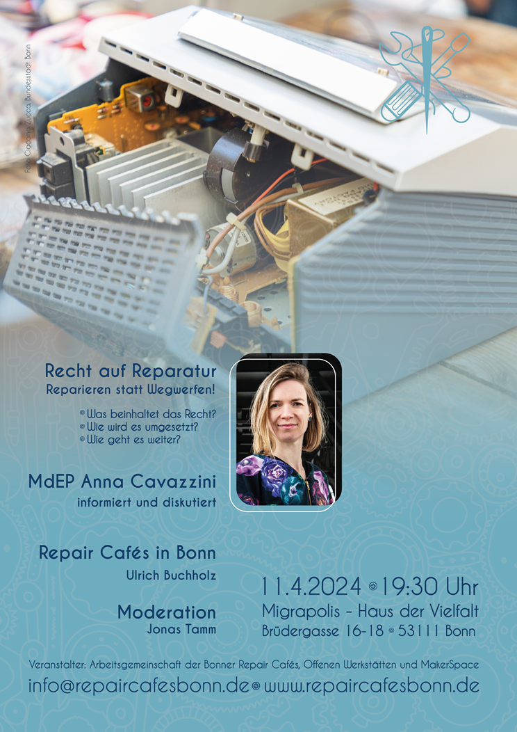 Die Arbeitsgemeinschaft der Bonner Repair Cafés, Offenen Werkstätten und MakerSpace führt zu dem wichtigen Thema eine Veranstaltung durch und lädt herzlich dazu ein. Täglich fällt in Deutschland tonnenweise Elektroschrott an. Eine Verschwendung von Ressourcen und Energie. Reparieren soll Standard werden. Die EU hat sich Anfang Februar 2024 über das „Recht auf Reparatur“ geeinigt und die „Richtlinie zur Förderung der Reparatur defekter oder mangelhafter Waren“ auf den Weg gebracht. Mit der Richtlinie werden Regelungen eingeführt, wonach europäische Verbraucher*innen bestimmte defekte Geräte künftig einfacher reparieren lassen können. Nach der Einigung der EU auf die Richtlinie muss sie im Amtsblatt der EU veröffentlicht werden und tritt 20 Tage später in Kraft. Dann muss sie innerhalb von 24 Monaten in nationales Recht umgesetzt werden. Was beinhaltet das Recht? Wie wird es umgesetzt? Wie geht es weiter? MdEP Anna Cavazzini wird darüber informieren und diskutieren. Sie ist seit 2019 für BÜNDNIS 90/DIE GRÜNEN im Europaparlament und Vorsitzende des Ausschusses für Binnenmarkt und Verbraucherschutz. Sie engagiert sich für das Recht auf Reparatur, eine echte Kreislaufwirtschaft, nachhaltige Lieferketten, einen starken Verbraucher*innenschutz und eine faire Handelspolitik. Außerdem wird bei der Veranstaltung auch über die vielfältige Landschaft der Bonner Repair Cafés, Offenen Werkstätten und den MakerSpace informiert.